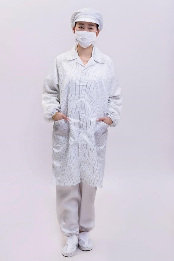 产品介绍采用防静电(可抗菌)无尘面料和专用辅料制作而成左胸前有工卡鼻,左手臂带插笔袋,两贴袋,翻领纽扣式产品成分面 料:(0.5cm条纹/0.5cm网格)100%聚酯长纤维(可抗菌)。导 电 丝:日本钟纺Belltron导电长纤维。主要辅料:白色树脂纽扣优点防静电性能好,穿着方便